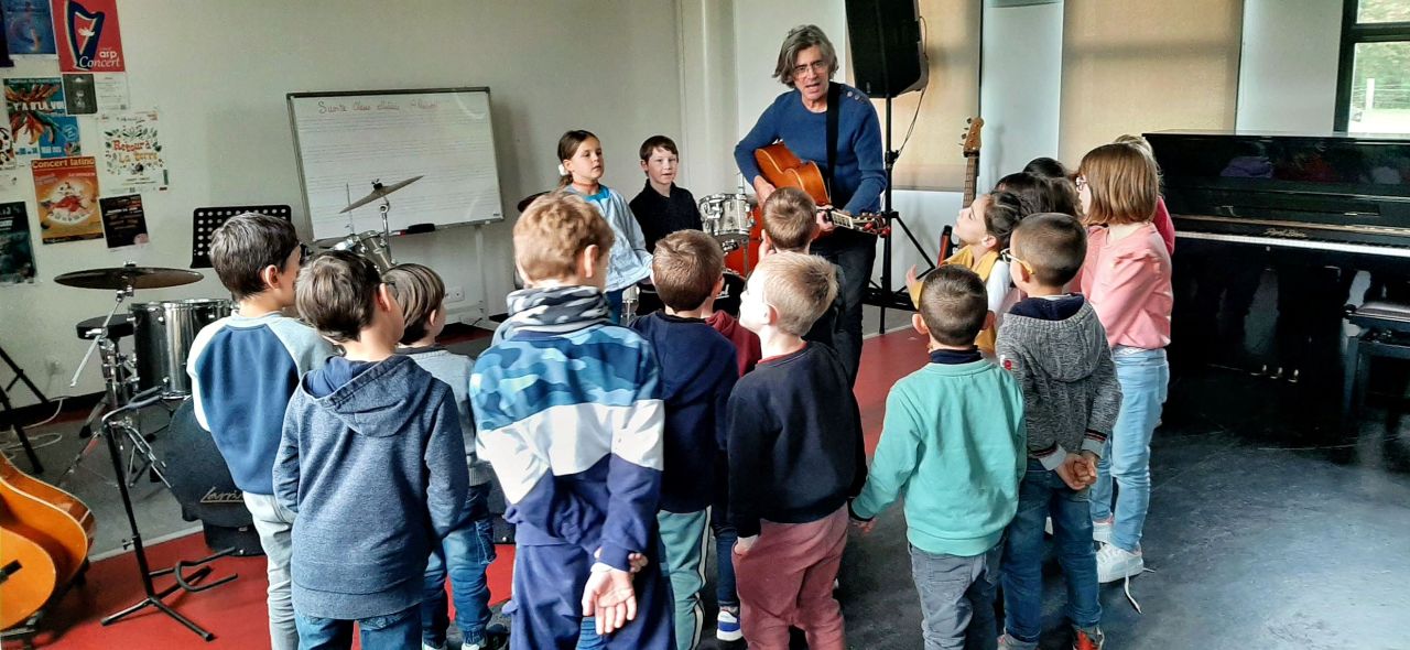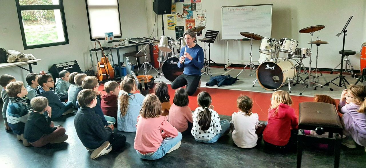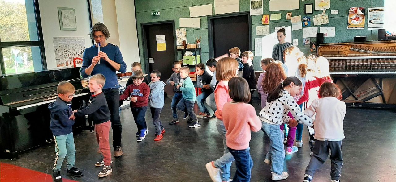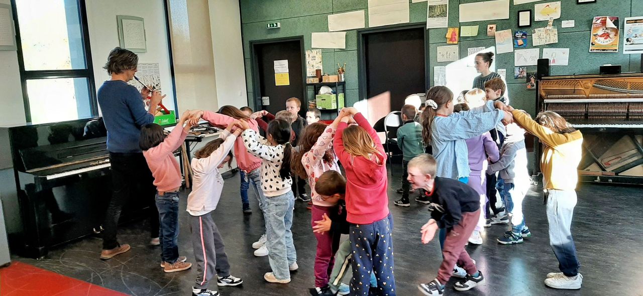 Avec Stéphane, l'intervenant musique de la Flume, les GS-CP-CE1 apprennent des chants bretons (la fougère, la ridée tourniquet, les hirondelles) et les danses associées. Ce n'est toujours facile de danser car il faut faire attention aux pas et à bien écouter la musique !
